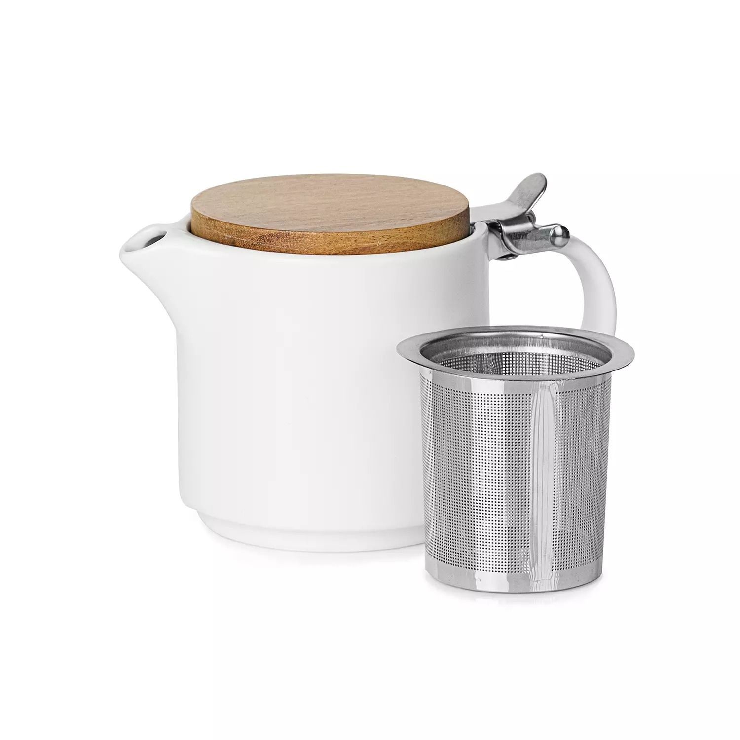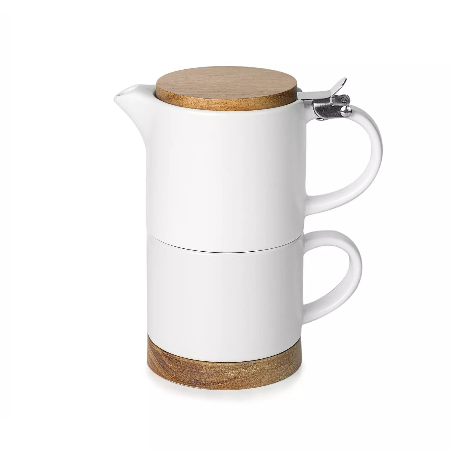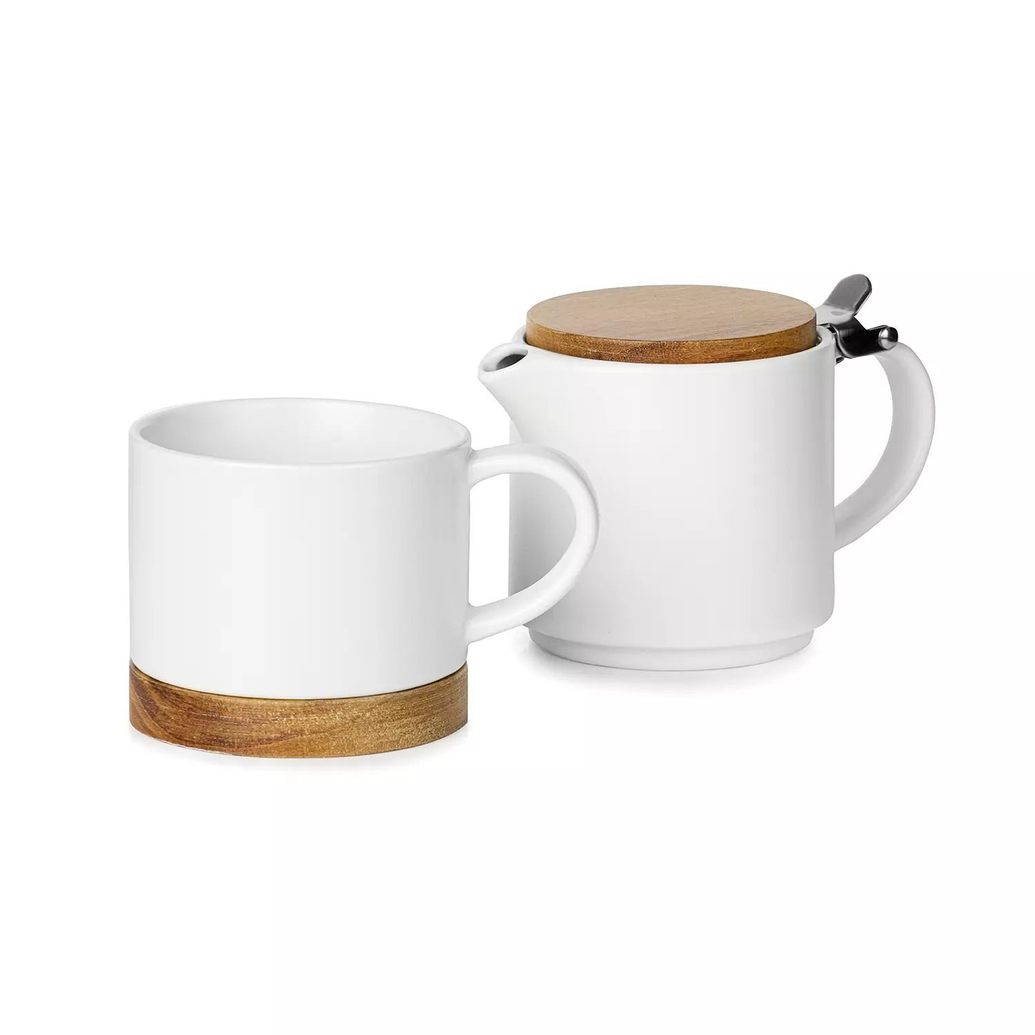 Juego de vajilla individual en color blanco con detalles en madera. Incluye tetera con infusor en acero inoxidable con tapa de madera y taza. Está especialmente diseñado para guardarse herméticamente una pieza sobre la otra. Fabricado en cerámica.